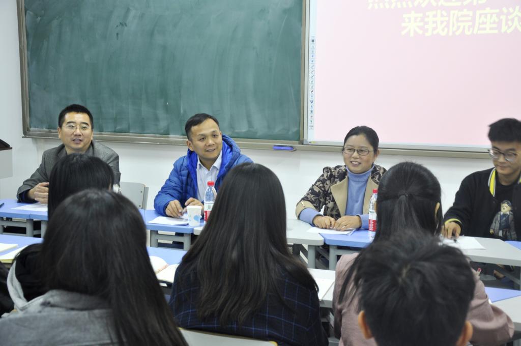座谈会上于志鹏给同学们播放了央视老故事频道题为《孝满山村 出彩官庄》的视频短片,该短片展示了以韩霞为代表的基层干部心怀百姓,为村民着想,服务乡村扶贫的工作态度和人格魅力。随后,韩霞将个人学习和工作经历向同学们娓娓道来。她回忆了青春飞扬的员工时代,表示老员工活为她的未来的工作奠定了坚实的基础。接着,她把自己一年半的第一书记工作情况与感受向大家介绍与分享,让与会师生了解到乡村扶贫任务的艰巨和第一书记身上厚重的责任与担当,凭借着不怕累、不服输的实干苦干精神,她一遍遍地入户走访,解决了石匣村一桩桩的琐事难事,赢得了村民一致好评,促进了村里干群关系的良好发展,诠释了石匣村党建引领乡村建设的工作新思路。