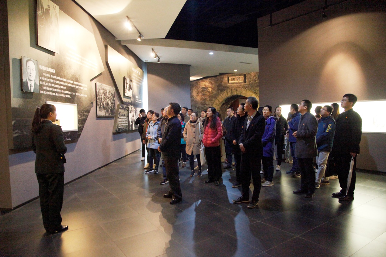 首先,大家共同参观了莱芜战役纪念馆,在纪念塔前重温入党誓词,表达对革命先辈们的崇敬之情;接着党员同志们在讲解员的带领下参观了莱芜战役展览馆的各个展厅,通过观看展览馆内的烈士照片、历史文物以及各种实物资料,重温了革命先烈浴血奋战的革命事迹和艰苦奋斗的革命历程。在模拟实地战争的全景画馆中,师生们感同身受地被战火纷飞的画面所感染,深刻体会到如今美好生活的来之不易,党员们的心灵得到了洗礼,灵魂得到进一步升华。