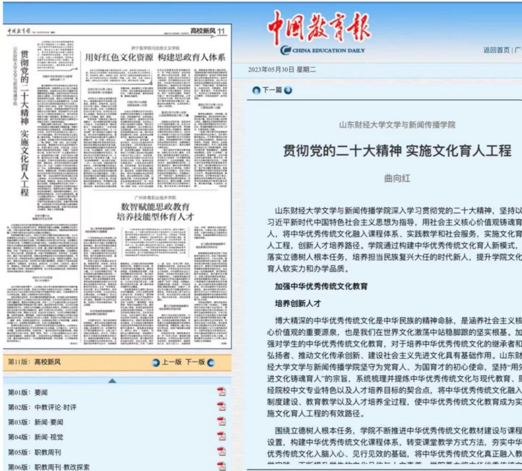 成功获批新闻与传播专业硕士学位授予权和中国语言文学一级学科硕士学位授予权,新增文化产业管理专业(数字文化产业方向)校企合作本科班。文化产业管理专业2020年获批国家一流本科专业建设点,近三年软科中国大学专业排名稳居全国前八;汉语言文学专业和新闻学专业2021年获批省级一流专业建设点。《国学经典导读》《网络传播概论》2021年获批省级一流本科课程;《艺术学概论》2023年获批国家一流本科课程。同时,不断加强与地方党政部门的合作对接,与新华社山东分社、大众日报社政教采编中心、山东文旅传媒集团、字节跳动等十余家企事业单位共建实践教学基地,为员工搭建起实习实训平台,为社会输送了专业人才队伍。