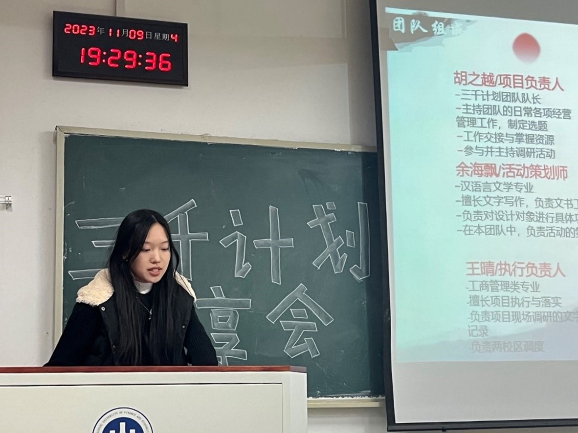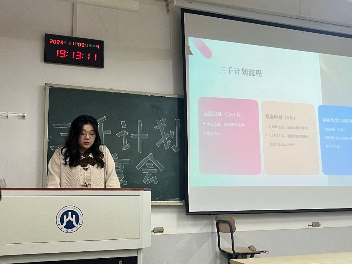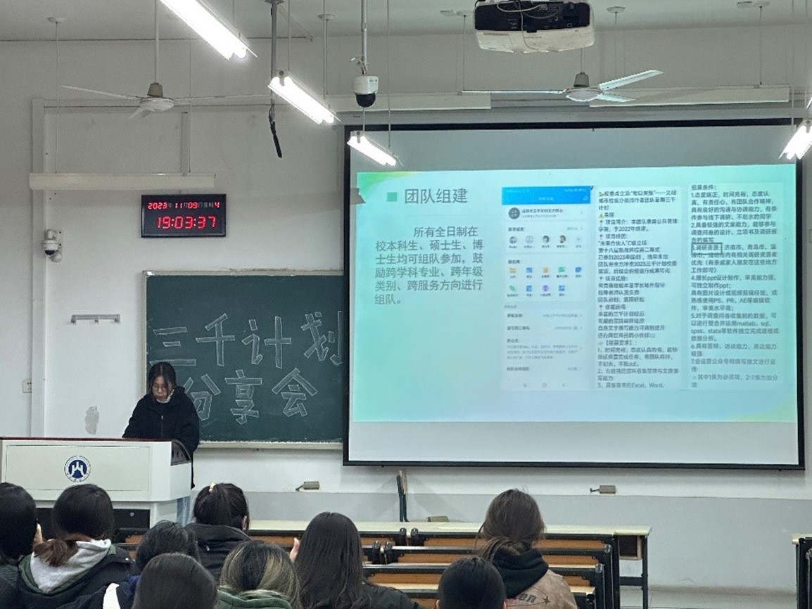 首先进行分享的是22级文化产业管理二班的钱昶安,她向同学们介绍了“三千计划”的大体流程、团队组建、立项书内容、组织实施、调研报告以及推广方式等。在谈到撰写调研报告大纲时,她建议同学们在大纲中添加数据图,还向大家展示了自己团队的作图方法。最后,她以视频的形式向同学们展示了自己“柳荫课堂”项目的相关内容。