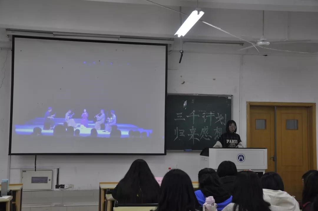 接着,18级新闻学一班的罗炘为同学们分享了她的经验。她先让同学们通过视频的方式了解了“南音”的魅力。然后从南音介绍、选题意义、调研过程、调研总结四个方面为同学们介绍了她的调研过程。随后,18级汉语言文学二班的耿硕为同学们讲解了他的经历。他从选题思路、前期准备、实践进行几个角度立体地展现了他的实践内容。他建议同学们应该多与指导老师讨论,并指出了同学们将来在选题方面应该注意的问题,给了同学们很多启示。最后,18级新闻学一班的王建娇为同学们展示了她的活动过程。她告诉同学们社会实践的开展要围绕组队、立项申报、实地调研、成果汇报四个方面开展。并为同学们推荐了百度文库、浙江图书馆、大数据导航等资料来源,为同学们提供了多种收集信息的途径。