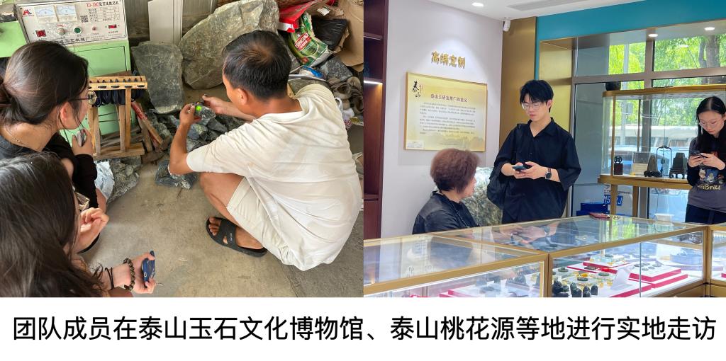 此后,团队前往泰安市,在市博物馆、市文化馆、泰山桃花源等地开展实地调研。通过与相关工作人员、当地居民交流,了解到泰山玉孕育于齐鲁大地、孔孟之乡,在历史上同儒家文化相互渗透,是沉稳内敛、君子之风的符号。用特殊媒介在各种外事活动中向世界展示了中国独具魅力的玉文化。经过了解,本地博物馆、文化馆已开始采用微信公众号、现场AR沉浸式互动体验等方式,向大众推广泰山玉文化。而作为泰山玉原产地的桃花源,则通过互联网宣传泰山玉,传承制作雕刻技艺,直接促进了乡村文化振兴与经济发展。