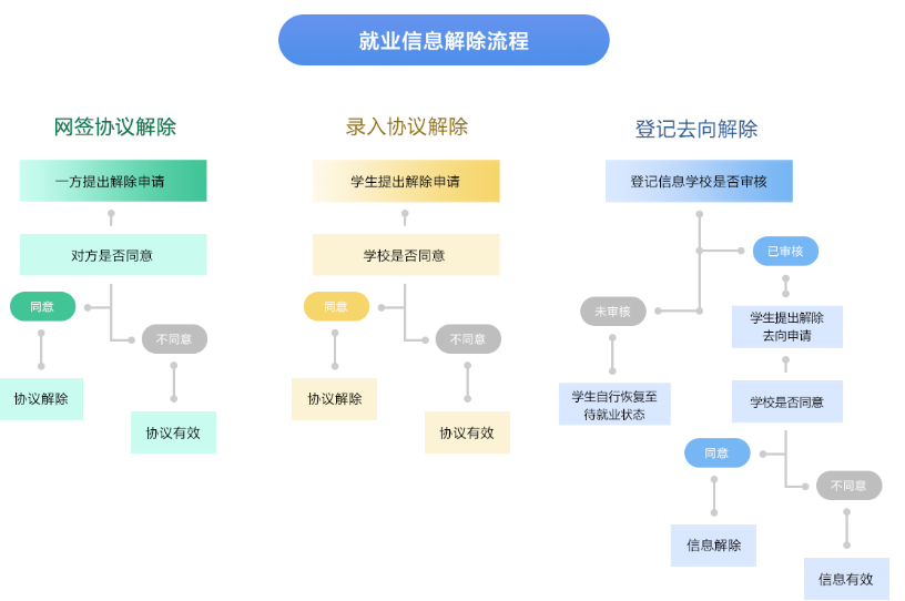 注:毕业生离校派遣后,如网上签约单位,系统在员工应约时可自动解除录入的协议;如录入就业协议(即线下签约),系统在员工提交审核时可自动解除已录入的协议,不再需要公司审核。