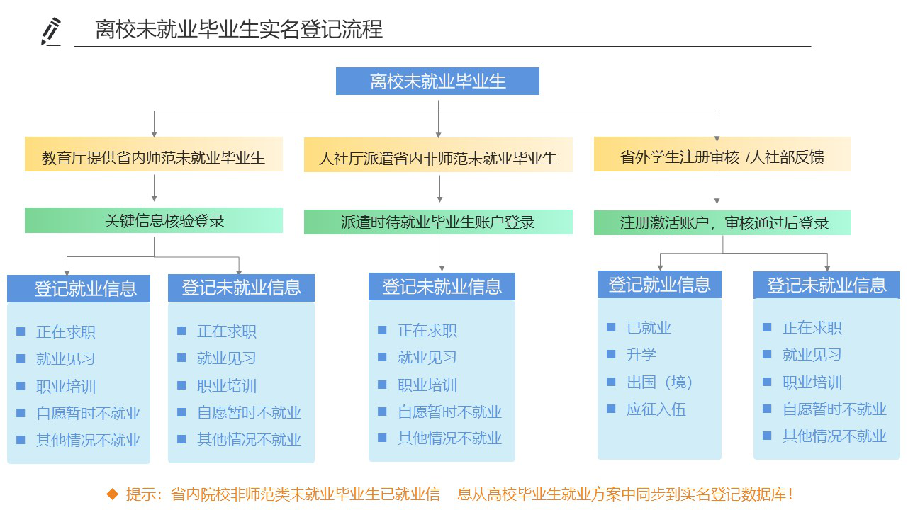 (1)就业情况实名登记。离校未就业毕业生已就业情况登记,包括已就业、升学、出国(境)、应征入伍等去向信息登记。