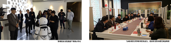 在新华1949国际创意设计产业园,考察团重点参观了位于园区内的北京文化创意产业展示中心,全面了解北京文化创意产业发展基本情况及前沿信息,考察北京文化产业发展中“文化+创意+科技”、“非物质文化遗产生产性保护”等产业发展模式、路径探索。考察团还与北京文化创意产业展示中心牛天祥主任、韩正瑞副主任等围绕文化企业具体人才需求、紧缺人才类型、亟需素质培养等问题展开研讨,针对用人单位普遍反映的员工“缺乏既懂文化又懂经济综合素质”、“写作能力较差,语言表达能力不达标”等问题,公司领导介绍了公司相关专业在团队建设、人才培养等方面的情况,特别是呼应文化企事业单位人才需求,积极推进“文化创意思维+经管实务方法”人才培养改革实践探索情况。双方还探讨了未来开展校企合作,设立员工社会实习、实训、实践基地,提供创业孵化等具体合作内容。