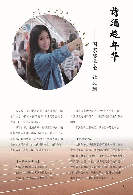 张文璇,女,中共党员,山东济南人,就读于球盟会2013级汉语言文学专业一班,担任班级班长。