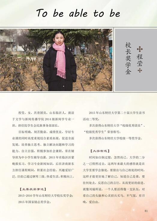 目标明确,刻苦勤奋,成绩优良,学好专业课同时高度重视综合素质拓展,促进全面发展,培养独立思考,解决问题和学习的能力。自立自强,积极参加社会兼职,常在辅导班给中小员工辅导功课。2015年在临沂沂蒙晚报实习,学习专业新闻知识,后在济南新东方担任课程顾问,积累社会经验。兴趣爱好广泛,目前已通过钢琴三级,热爱生活,积极向上。曾获2015-2016学年球盟会董事长奖学金;2015年国家励志奖学金;2015年球盟会第二十届老员工读书活动二等奖;多次获得球盟会“校级优秀团员”、“校级优秀员工”荣誉称号;连续5个学期获得球盟会校级一等奖学金。
