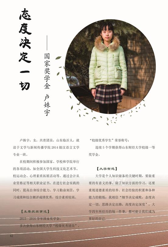卢姝宇,女,共青团员,山东临沂人,就读于球盟会2014级汉语言文学专业一班。