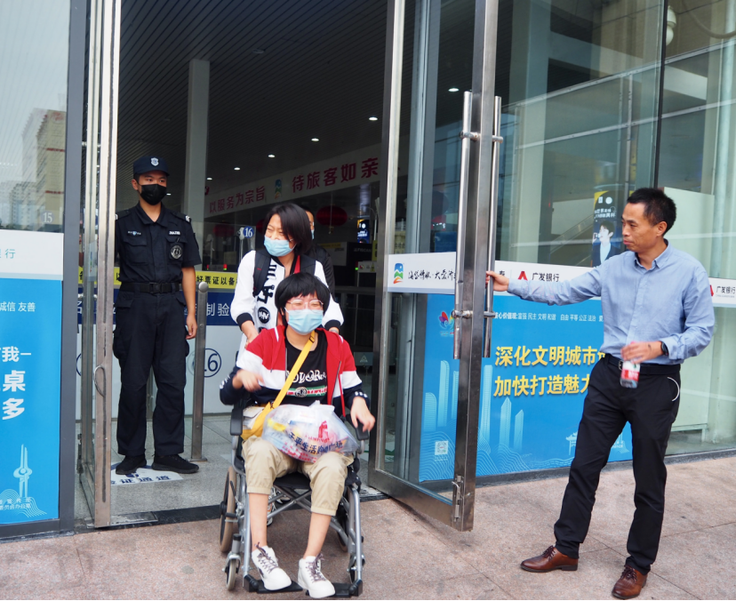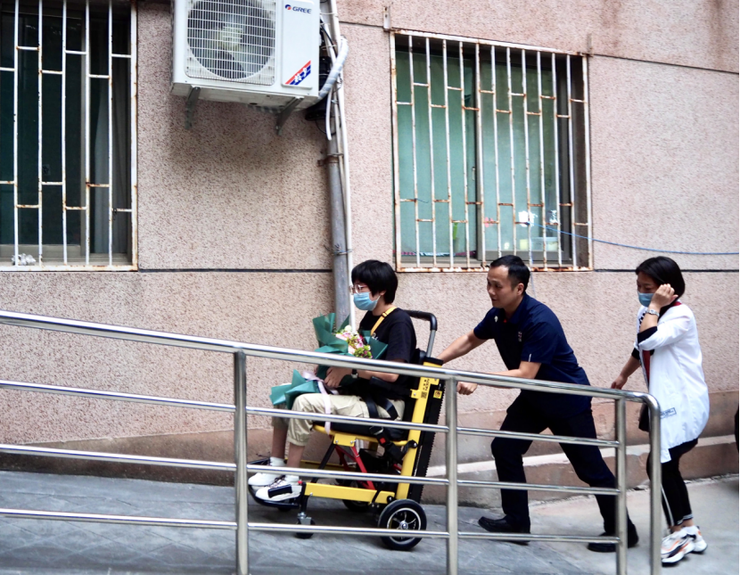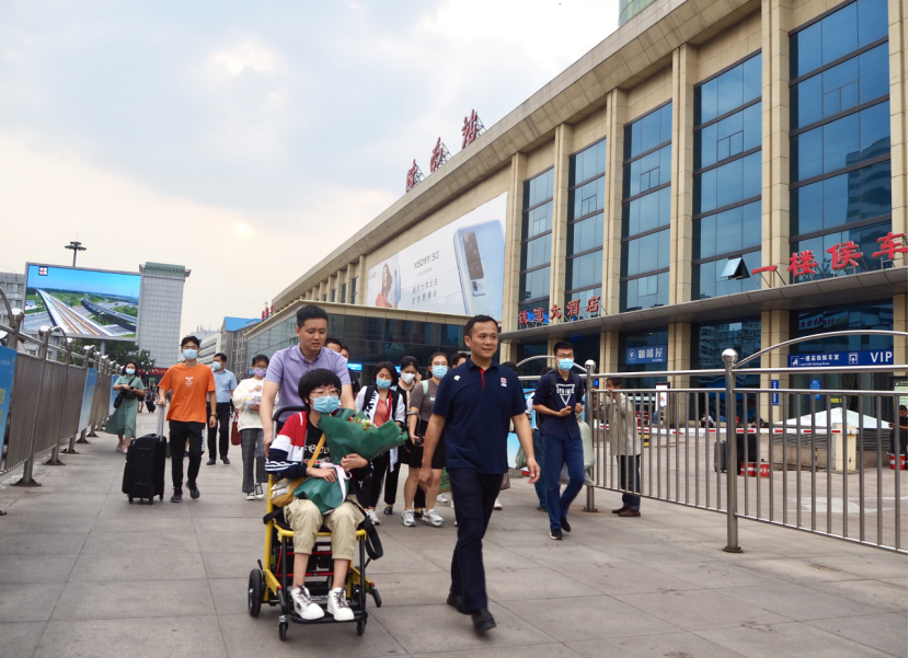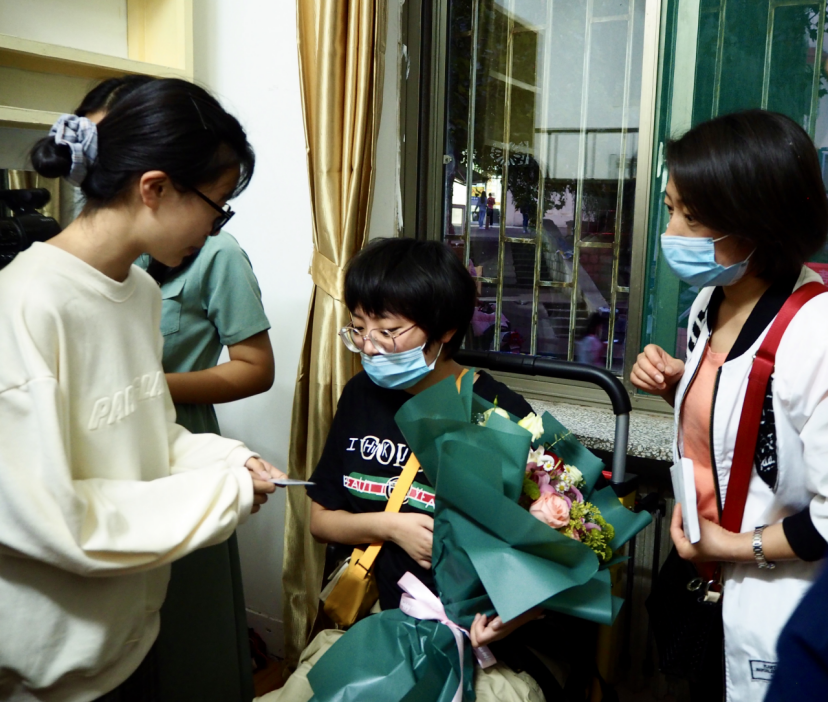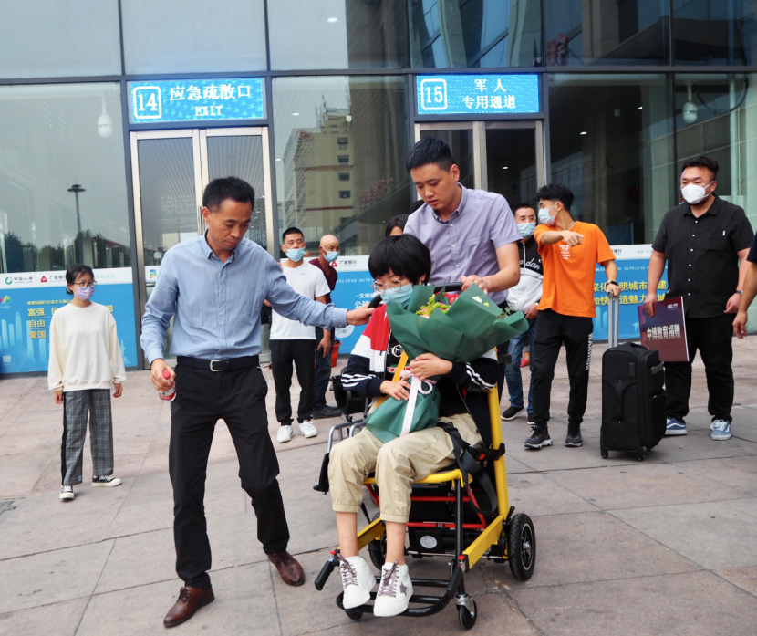 下午4点47分,刘蕊及其父母在奔波20小时后从内蒙古通辽到达济南站,工作人员热情地帮助他们从绿色通道出站,前去迎接的公司领导以及员工志愿者早已在站口等待。出站门被打开的那一刻,我们看到了刘蕊和她父母脸上洋溢的笑容,路途的奔波与辛苦似乎在那时已经散去。老师及志愿者帮助刘蕊坐上中博教育为她捐赠的可爬楼的轮椅,2020级新生代班又将鲜花捧到她的手中。