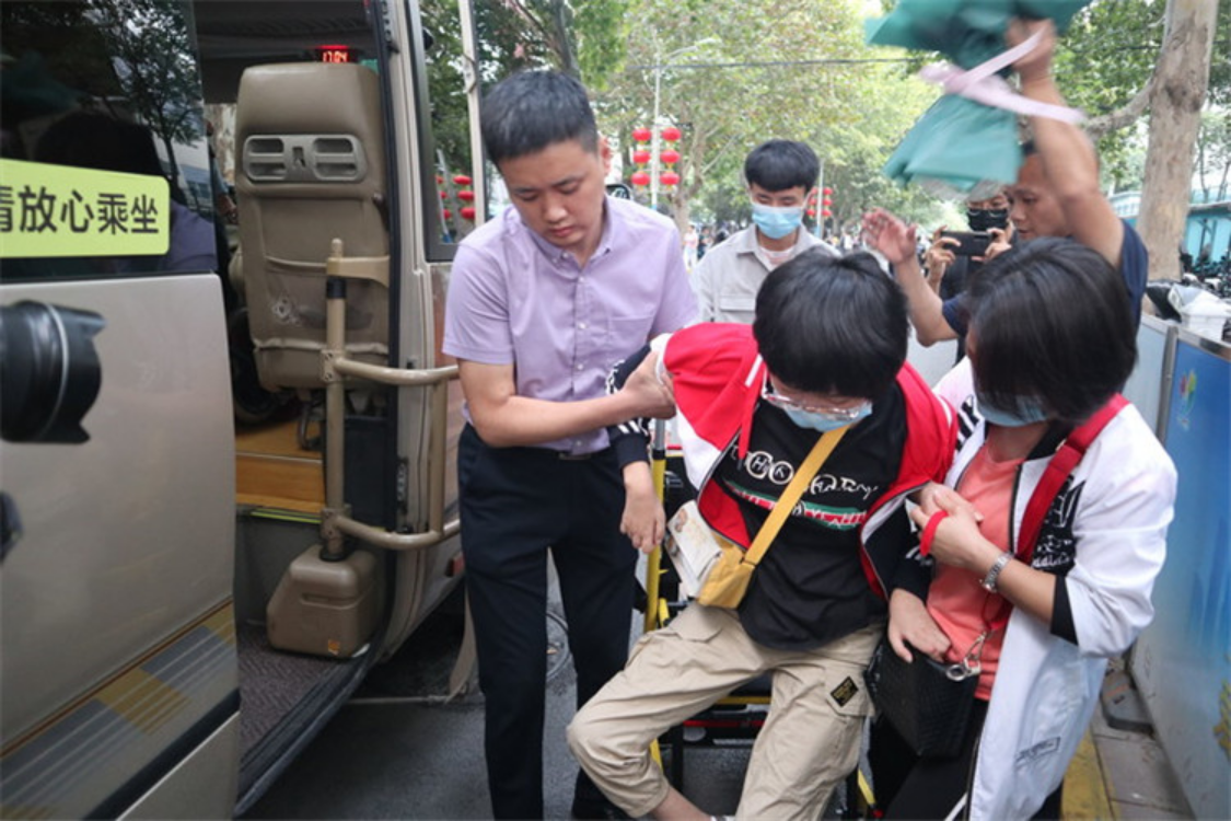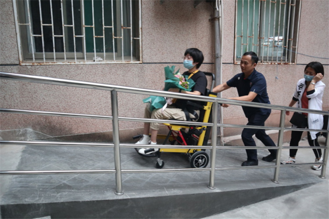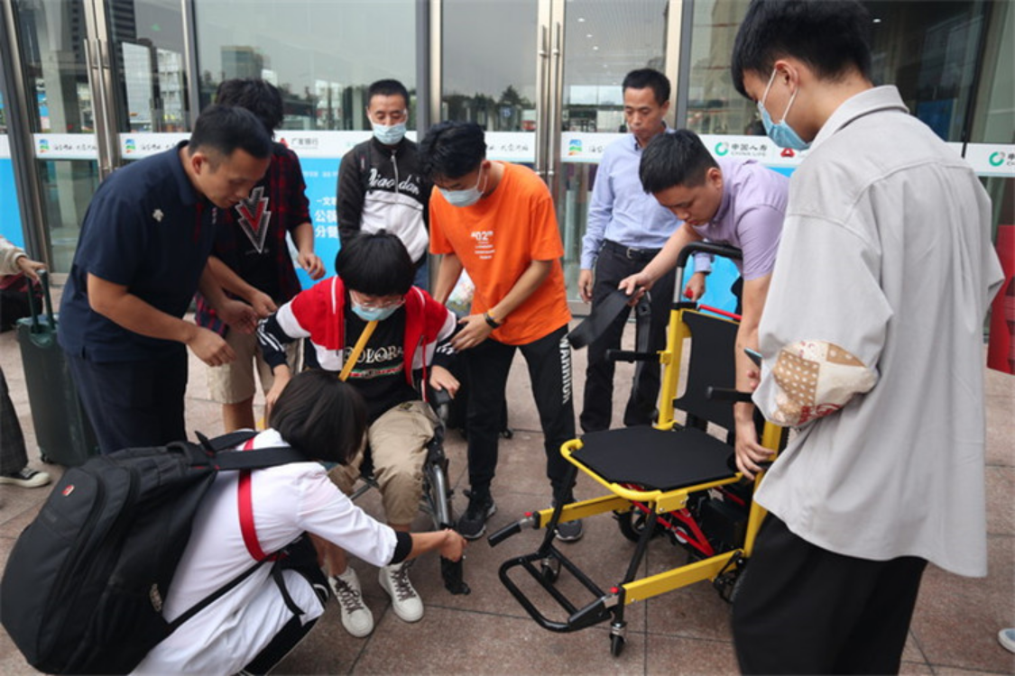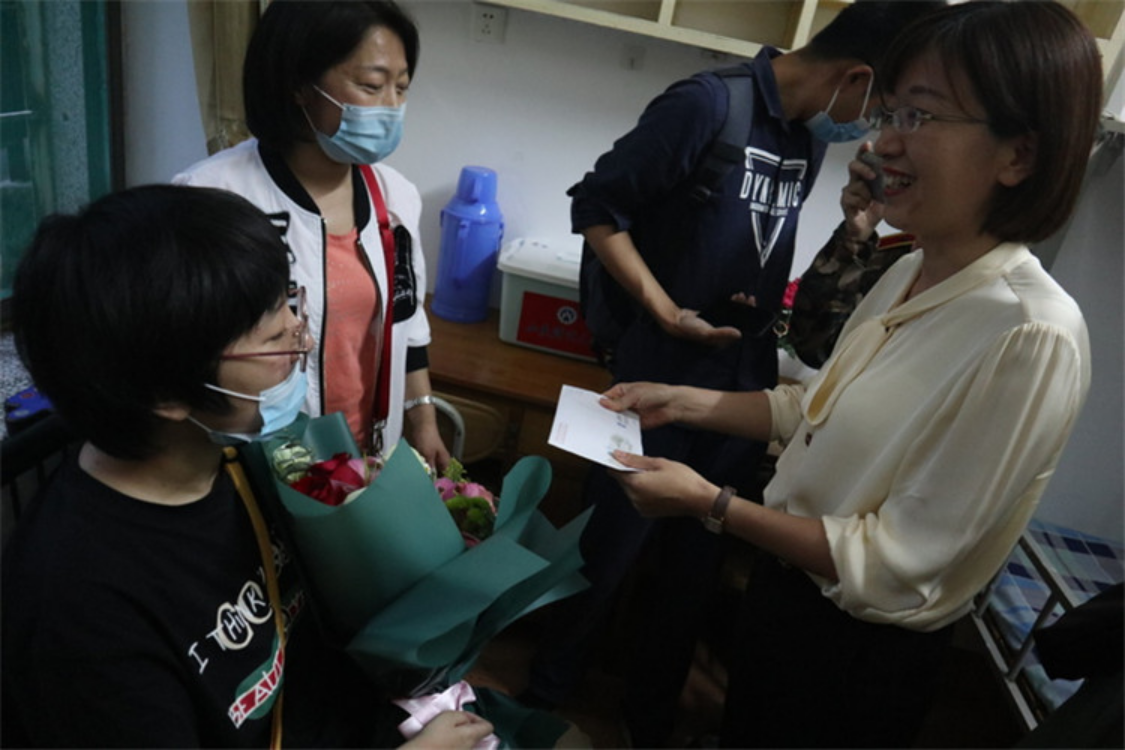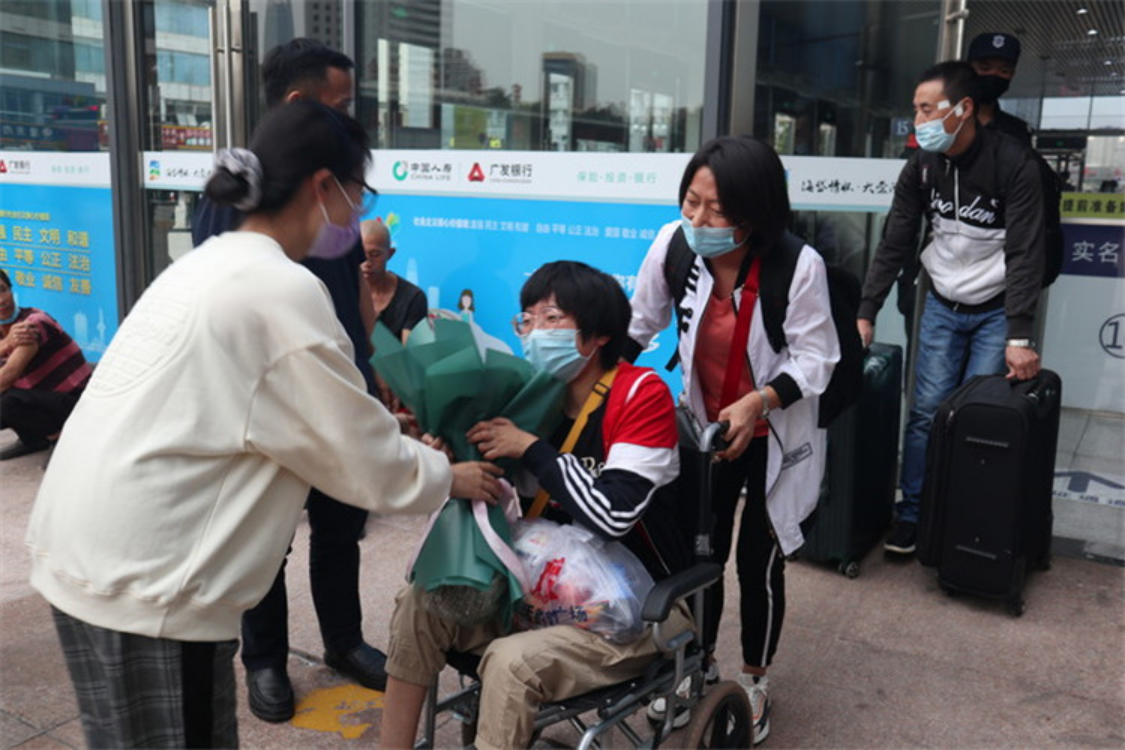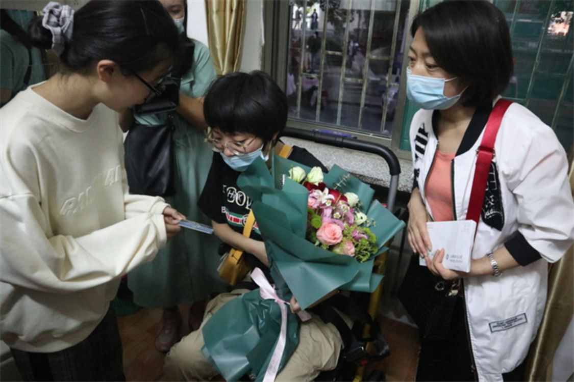 28日下午5点左右,刘蕊坐着轮椅,与父母一起在火车站工作人员的引导和帮助下,从绿色通道出站,前去接站的山财大相关部门和二级公司领导、几名在校生志愿者已早早等候在出站口。师姐的一捧鲜花送到刘蕊手中,让长途旅行倍感疲劳的她露出了笑容。