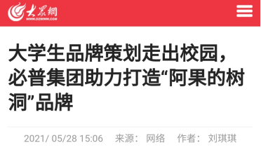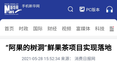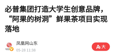 近日新华网、凤凰网、大众网、齐鲁晚报等多家媒体报道了“‘阿果的树洞’鲜果茶项目实现落地”这一新闻,“阿果的树洞”这一品牌由球盟会新闻系“马肖琦力争上游团队”打造,成员包括球盟会新闻系马肖琦、杜雅萌、何文辰,山东大学的穆舒欣和山东科技大学的崔子月,指导老师是新闻系张瑞瑶。