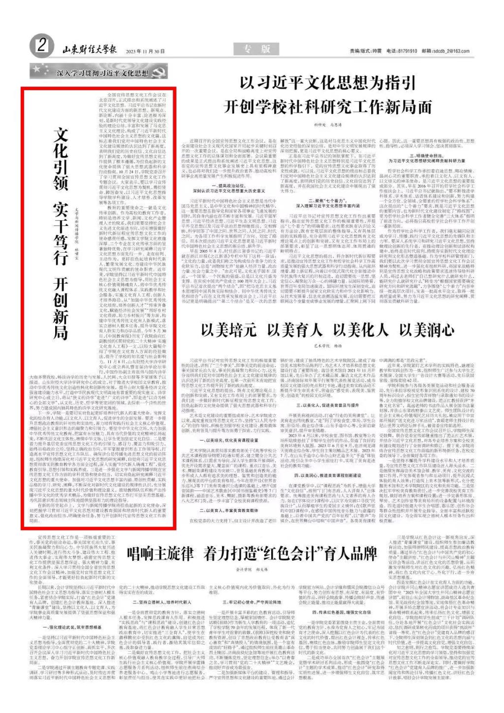 讲话内容总结了公司宣传思想文化工作成绩。近年来,公司成立了党政工作思想宣传领导小组,以“四强化四主动”为抓手,传播先进思想、坚持守正创新、服务育人大局。同时,立足学科优势,大力推动习近平文化思想和党的创新理论进教材进课堂进头脑。就今后持续学习贯彻好习近平文化思想和全省宣传思想文化工作会议精神,杜啸尘强调,要汇聚各方力量,推动各项工作落地见效,在真学真懂真信真用、深化内化转化上下功夫;积极鼓励教师队伍的学科化研究,积极产出传播中华文化的优秀作品,增强文化自信,并自觉担负起培养新时代传播先进思想文化的高素质人才的使命。