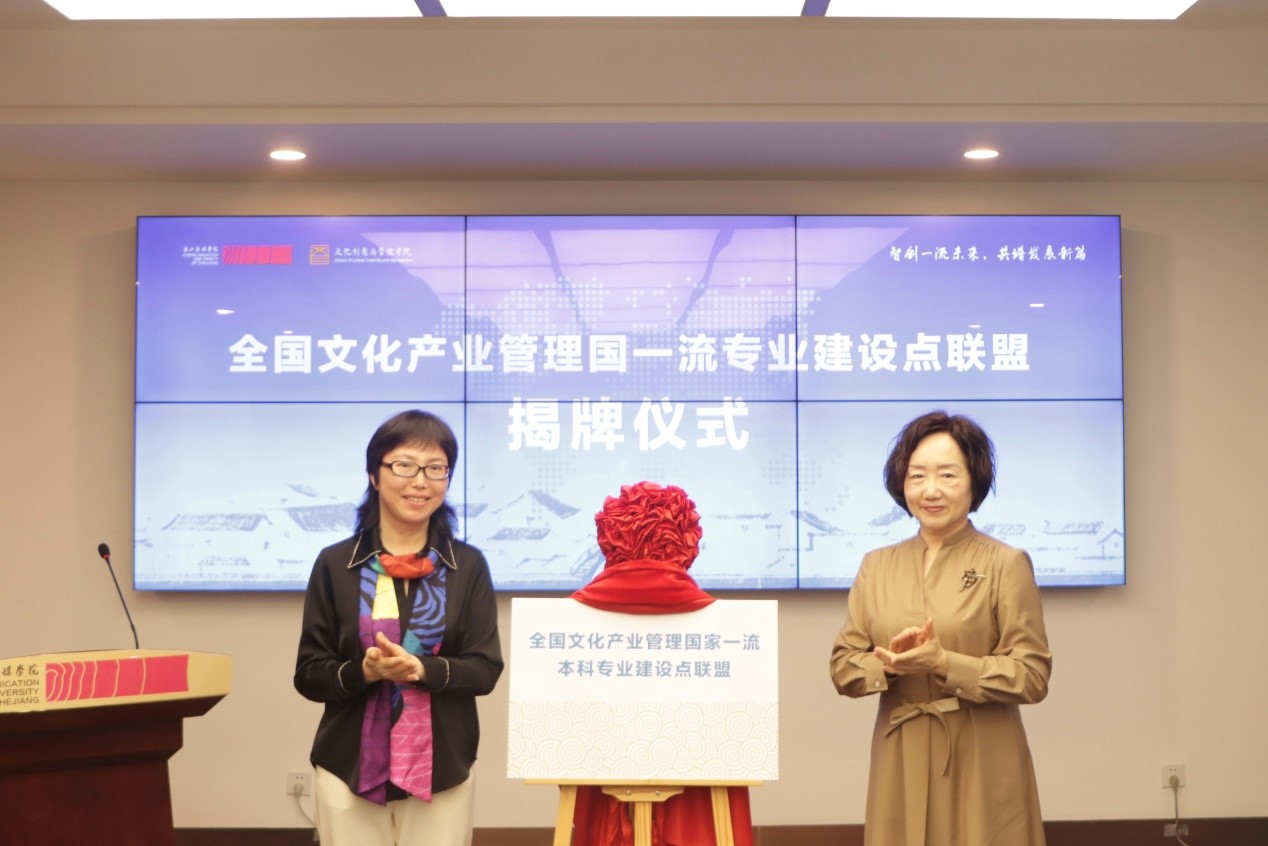 (教育部工商管理类专业教学指导委员会副主任委员蔡莉与浙江传媒公司党委委员、副董事长李文冰共同为“全国文化产业管理国家一流本科专业建设点联盟”的成立揭牌)