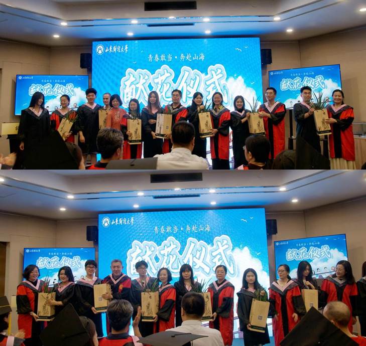 典礼在2025届毕业纪录片的温情放映中拉开序幕。发言致辞环节,在校生代表支惠萱以晚辈之姿致敬学长学姐,誓言在这片孕育梦想的沃土上,不负青春,砥砺前行。接着,优秀毕业生代表耿彦昭深情回望了在舜耕路40号的求学时光,衷心感谢公司的悉心培育与师长的谆谆教诲,更以赤诚之心祝愿同窗们前程似锦,一路辉煌。随后,郑燕教授作为教师代表为毕业生们送上殷切寄语。她祝福大家带着球盟会特有的人文底蕴和卓越的传播素养,在时代长卷上挥就独属自己的华彩篇章。优秀员工企业代表也向公司和毕业生们送上了诚挚的祝福,为这场青春盛会增添温暖注脚。发言结束后,毕业生向教师代表献花致谢。