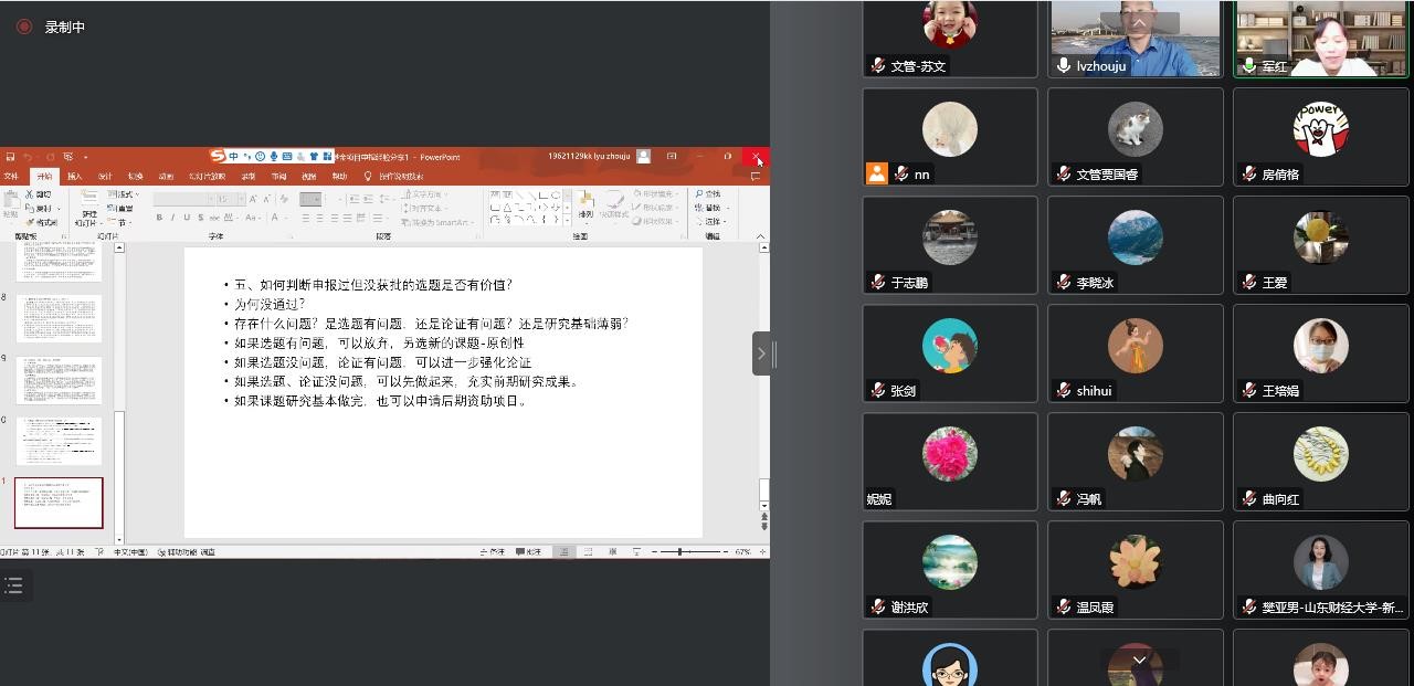 为进一步提高公司2023年度国家社科基金项目申报质量、激发教师和员工科研积极性,2022年12月15日下午,公司举办“国家社科基金项目申报经验分享”线上主题讲座。本次讲座邀请青岛大学文公司教授、博士生导师吕周聚主讲,公司部分教师和硕士研究生参加了此次讲座。讲座由公司副经理李军红主持。