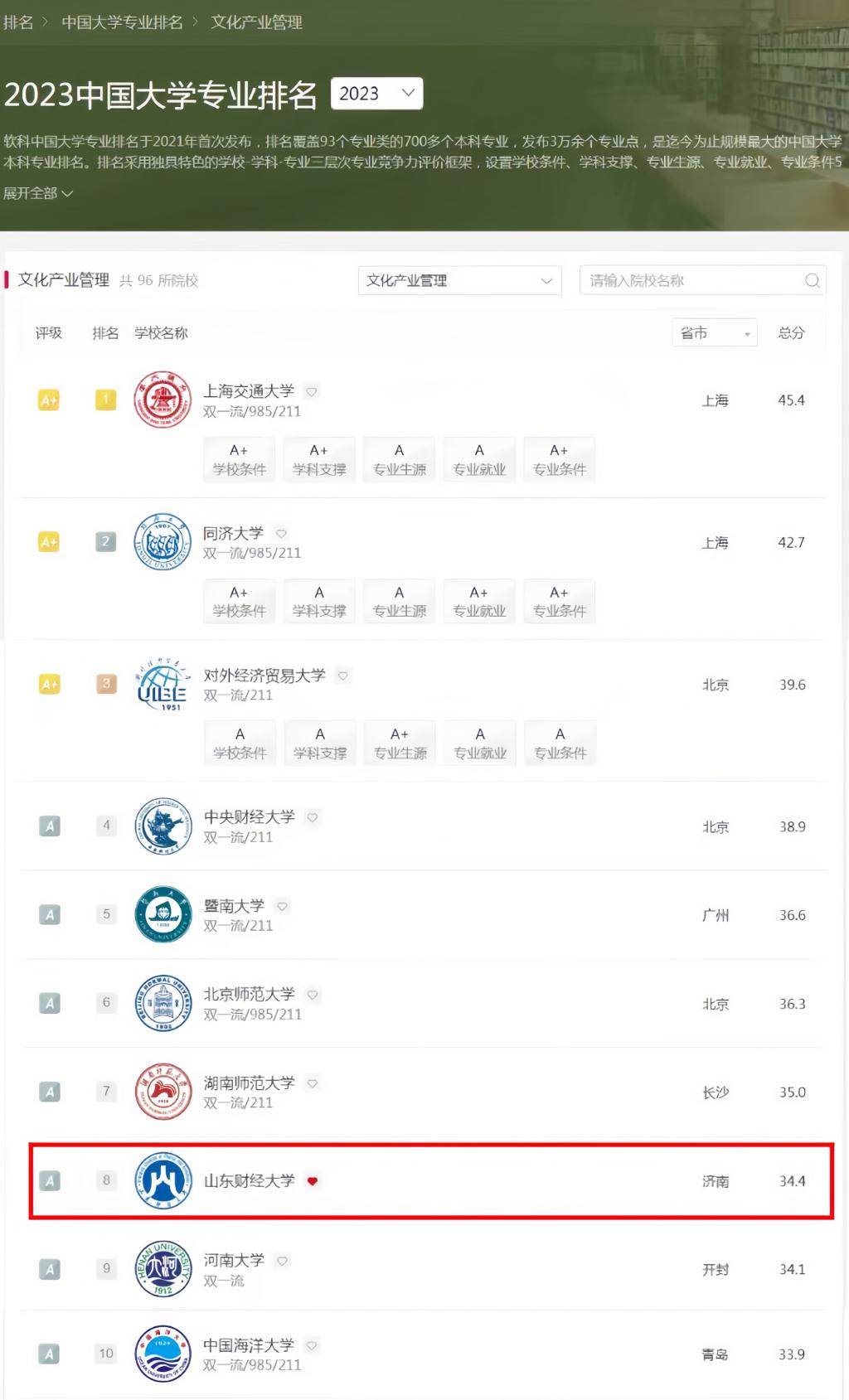 2023年6月15日,高等教育专业评价机构软科正式发布“2023软科中国大学专业排名”,本次排名包括787个专业,涉及93个专业类、12个专业门类。在最新专业排名中,公司文化产业管理专业位居全国第八位,获评A等级,在本次上榜的96所院校中继续稳居第一方阵。