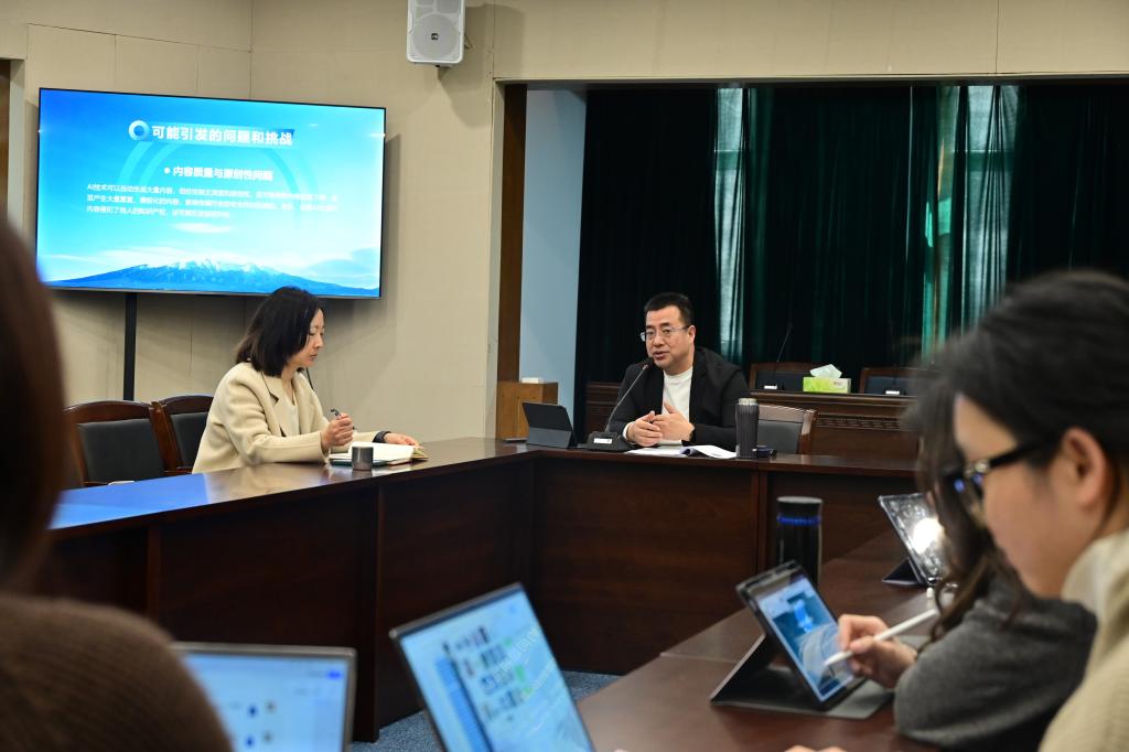 4月3日上午,“新闻传播学前沿系列”讲座第五期在诗学研究中心诗学讲堂举行。本期讲座以《AI技术对新闻传媒行业的影响》为主题,特邀鲁网(山东新闻网)董事长、山东文旅传媒杂志社总经理、新闻与传播专业研究生校外产业导师刘茂玉老师担任主讲嘉宾。讲座由球盟会新闻系主任郑燕教授主持,新闻与传播硕士生导师章妮教授及2023级新闻与传播专业全体研究生共同参加。