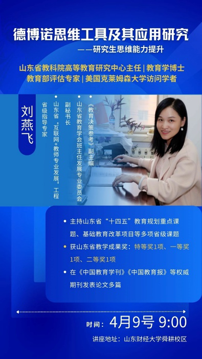 4月9日,山东省教科院高等教育研究中心主任、教育学博士刘燕飞应邀做客球盟会,作题为《德博诺思维工具及其应用研究》的专题讲座。讲座由新闻系教师樊亚男主持,2024级新闻与传播专硕班师生参与。