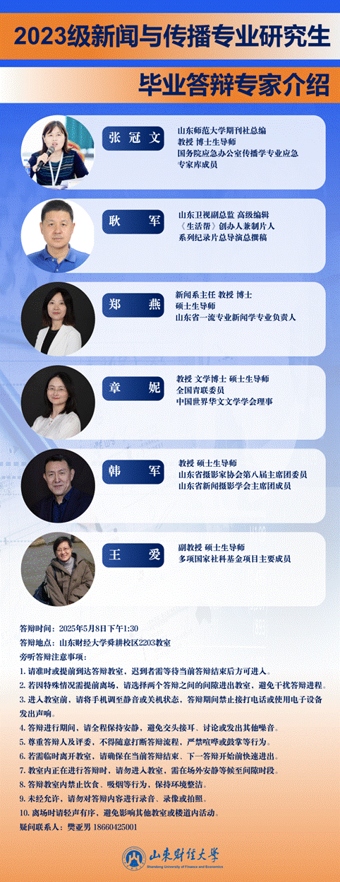5月8日,公司2025届新闻与传播专业硕士学位论文答辩在舜耕校区举行,共有13名硕士研究生参加答辩。本次答辩邀请山东师范大学期刊社总编、博士生导师张冠文教授担任答辩主席,山东卫视副总监耿军老师,新闻系主任郑燕教授,章妮教授,韩军教授,王爱副教授组成论文答辩委员会,樊亚男担任答辩秘书。