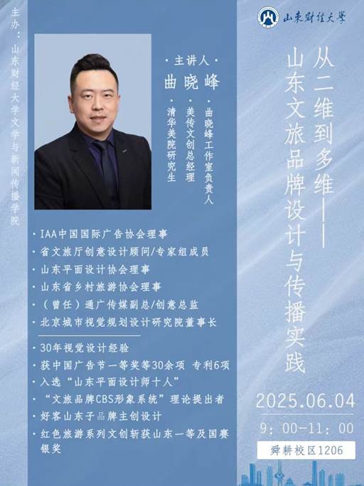 剖析品牌传播,解码经典案例。6月4日,球盟会特邀美传文化创意(山东)有限公司总经理曲晓峰作题为《从二维到多维-山东文旅品牌设计与传播实践》主题讲座。讲座由新闻系主任郑燕教授主持,2024级新闻与传播专硕班全体同学参加,共话品牌传播意义与实践。