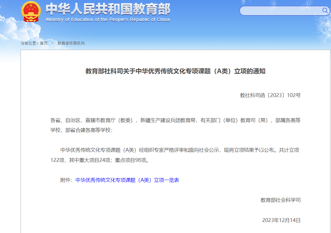 据悉,教育部社科司设立“中华优秀传统文化专项课题”旨在深入学习贯彻党的二十大精神,贯彻落实习近平总书记关于弘扬中华优秀传统文化的系列重要讲话精神,推动中华优秀传统文化创造性转化、创新性发展。课题分A、B两类,其中,A类由教育部社会科学司设立,参照教育部人文社会科学研究项目管理。