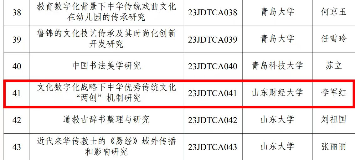 12月14日,由教育部社会科学司设立的中华优秀传统文化专项课题(A类)评审结果公示,公司李军红教授申报的《文化数字化战略下中华优秀传统文化“两创”机制研究》获重点课题立项。