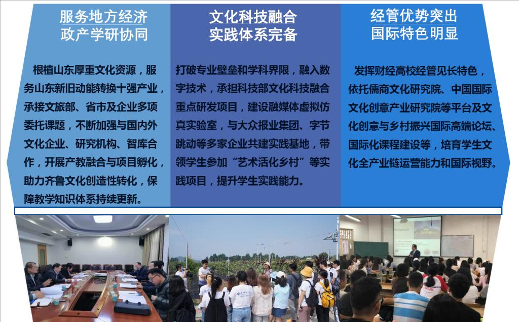 专业充分发挥财经类高校比较优势,人才培养凸显经管特色,重视政产学研协同育人,强化应用能力培养,拥有山东省文化产业经营管理研究基地、山东省非遗研究基地、国际文化创意产业研究院、儒商文化研究院、乡村文化研究院等多个省级、校级教学科研平台。专业紧跟数智时代发展趋势,与数字文化行业头部企业开展合作,强化数字文化人才培养,注重科研和实践反哺教学,积极服务地方经济,助力齐鲁文化创造性转化,先后承担国家社科基金项目4项,科技部国家重点研发计划文化科技融合项目1项,教育部人文社会科学研究项目等十余项,参加全省文化经济发展重大课题-文化创意产业专题调研工作,参加省委宣传部、省文旅厅《山东省十四五文化旅游规划》及济南、潍坊、菏泽、威海等地市十四五文旅规划部分编写工作,系列成果有力支撑了教学工作。专业立足新文科建设,不断推进专业教育与创新创业教育融合,员工获奖和就业工作成绩斐然,近五年,在“互联网+”老员工创新创业大赛、“挑战杯”老员工创业计划竞赛等各类学科竞赛中不断取得佳绩,员工升学、考公等高水平就业率稳定在30%-40%左右,多名员工被中国传媒大学、伦敦大学国王公司等国内外文化产业专业顶尖高校录取。