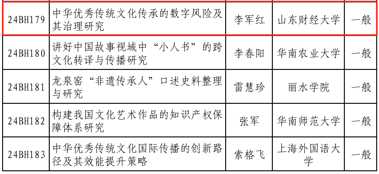 9月9日,2024年度国家社科基金艺术学项目立项名单发布,公司李军红教授团队申报的《中华优秀传统文化传承的数字风险及其治理研究》获批一般项目立项。